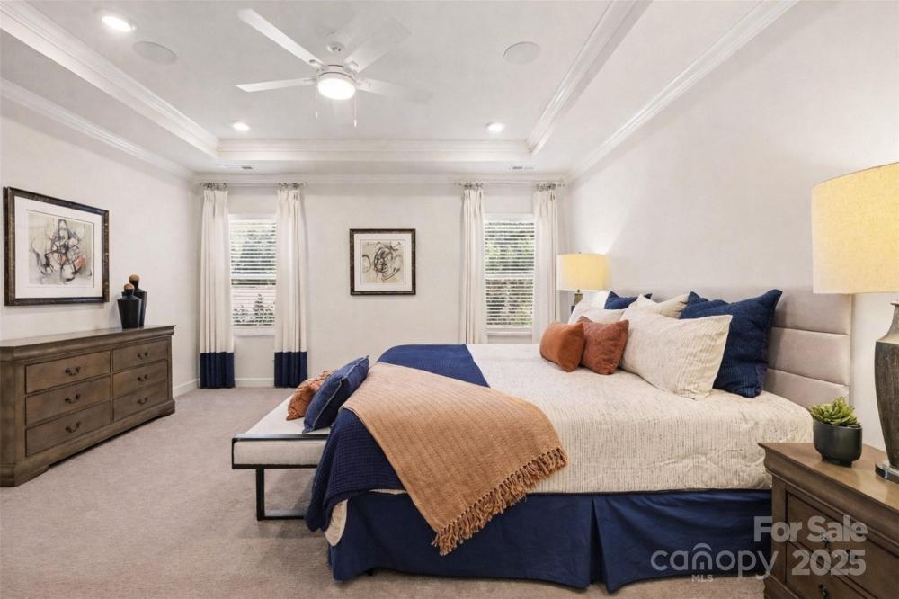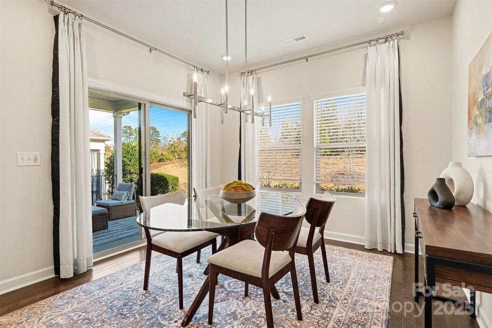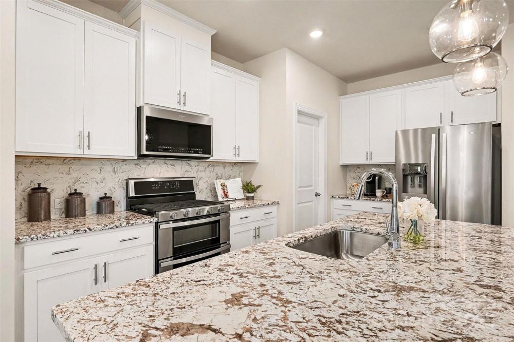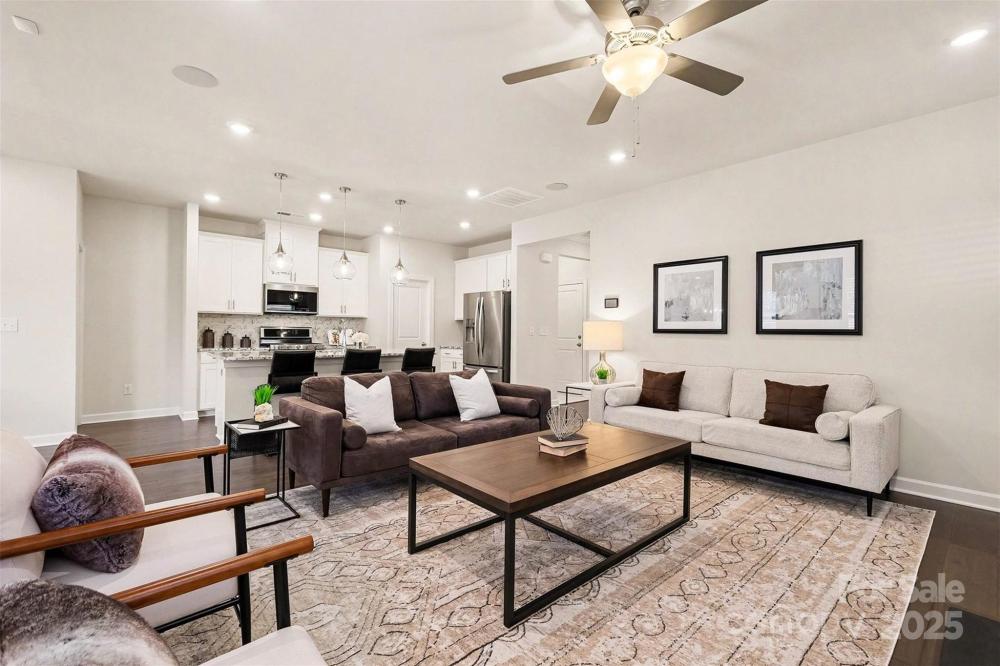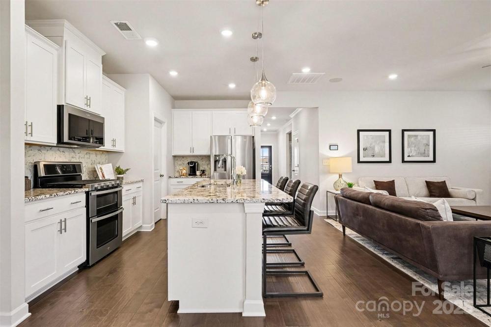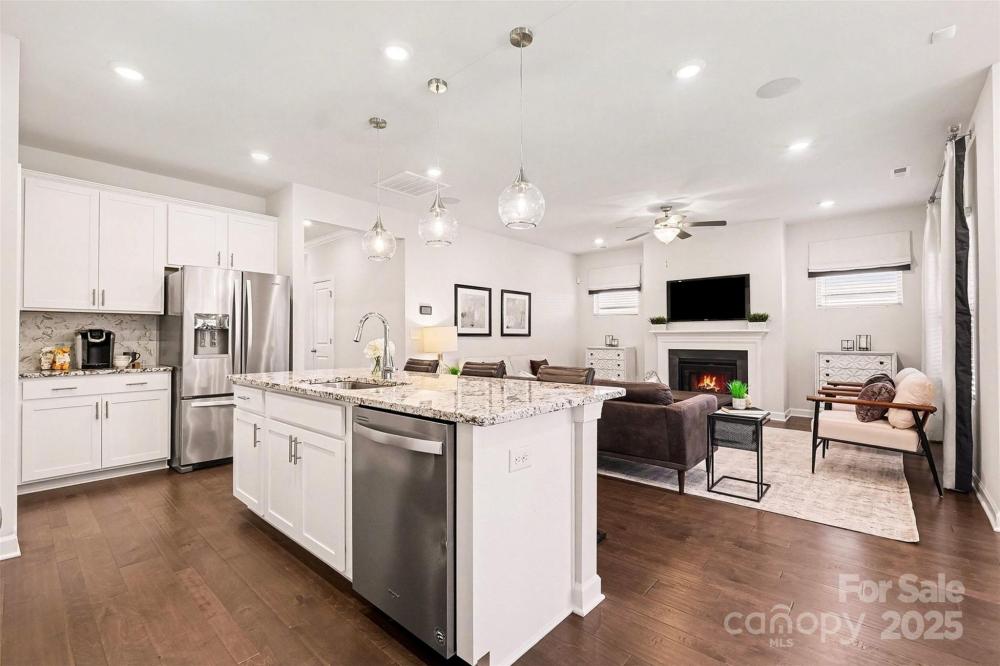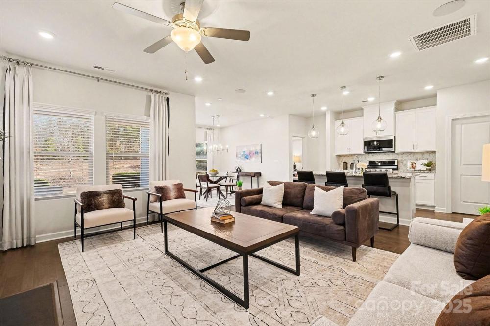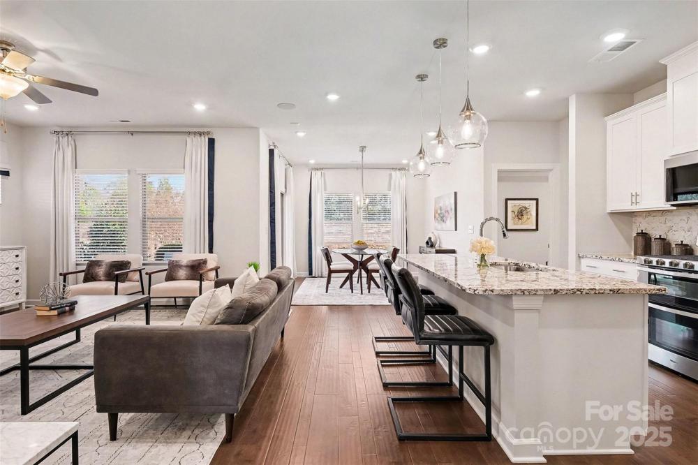 Designed to impress & built for ease, this former model home in Canopy Creek pairs modern comfort with refined style. Thoughtful upgrades include recessed lighting in every room, in-ceiling speakers, upgraded textured carpet, & custom curtains that enhance the polished, curated feel, all conveying with the home for designer style from day one. The open-concept layout is light-filled & inviting, anchored by a stunning kitchen with an oversized island, granite countertops, stainless appliances, & elegant pendant lighting. A covered porch extends your living space outdoors, perfect for morning coffee or an evening glass of wine. The well-planned split-bedroom layout enhances privacy, with secondary bedrooms at the front of the home & a tranquil primary suite secluded at the rear. Refrigerator, washer, & dryer are included, making your transition effortless. Built in 2018 with lawn maintenance included in the HOA, this home makes everyday living refreshingly simple. Enjoy resort-style community amenities including a pool & walking trails. Ideally located in Denver, a growing Charlotte suburb on the west side of Lake Norman, you’ll enjoy the quieter side of the lake with easy access to recreation, shopping, & dining.