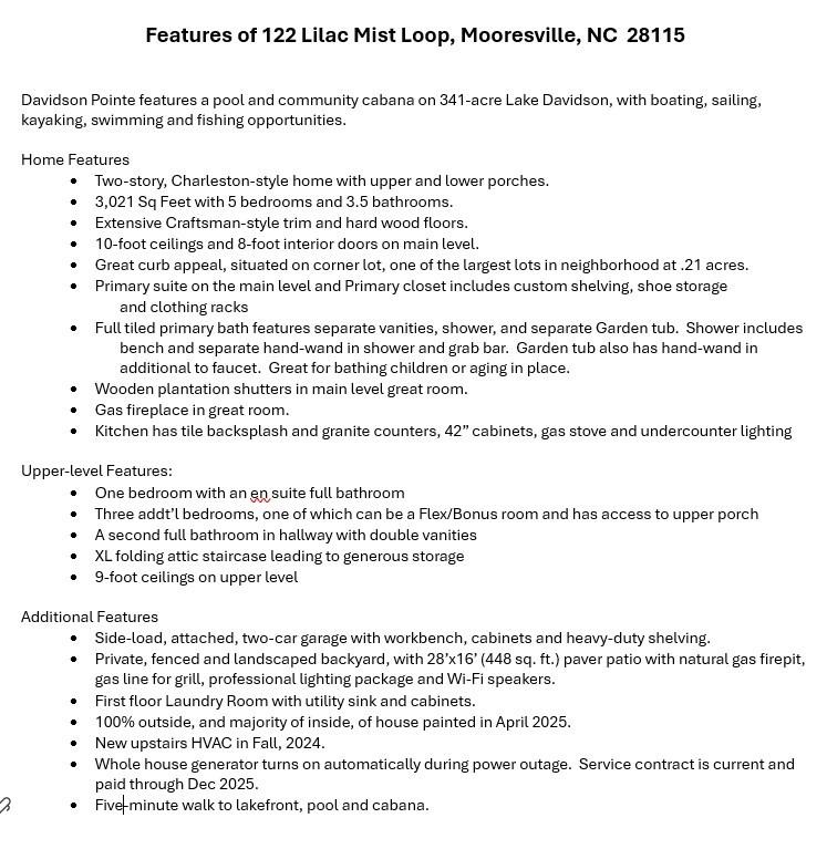 No sign in yard. Two-story Charleston-type home, 3,021 Sq Ft in beautiful Davidson Pointe community. Primary suite on main level of this 5-bedroom home with lower and upper porches. Large corner lot with side-load garage. Main level has 10' ceilings and handsome 8' interior doors. Dining, Living, Family Room and Kitchen share the main level with the Primary Suite as do the Laundry Room, Powder Room and large Pantry with slide out shelving. Laundry room has utility sink and cabinets. Kitchen has 42" cabinets and under counter lighting. Primary suite features a huge walk-in closet with custom shelving, shoe storage and clothing racks. Tile and granite in kitchen and bathrooms. Upstairs has four bedrooms, one with an en suite bath. A second full bathroom is also upstairs. Bedroom 5 can also be a Flex/Bonus room as it has access to the upper porch. Landscaped front and back yards. Backyard is fenced and features a 28' x 16' paver patio with natural gas fire pit, and natural gas line for grill hook-up. Whole-house generator turns on automatically if power goes out. Side-load two car garage has workbench, cabinets and heavy duty shelving over the garage door. Wide driveway for addt'l parking. Entire outside and majority of inside painted in 2025. Five minute walk to Pool, Cabana and Lake Davidson. Professional photos will be uploaded prior to Live Date of Oct 17.