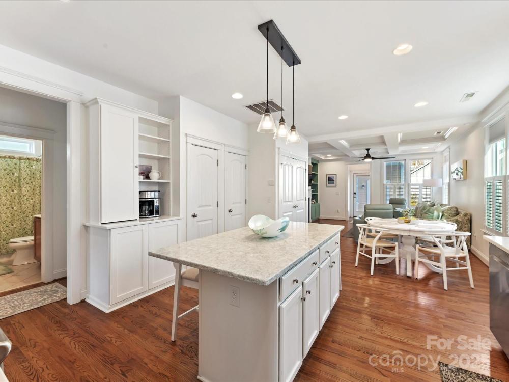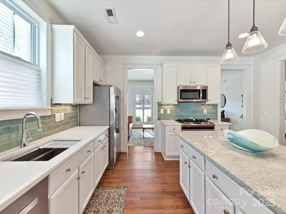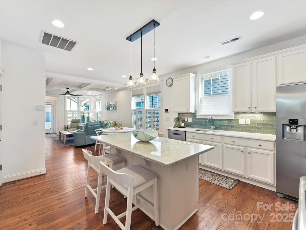 Highly sought after Davidson Pointe, extremely rare Saussy Burbank Ranch, with rocking chair front porch! This waterfront community resting on the shores of Lake Davidson (borders 3 sides of the community), has so much to offer! Hardwood floors, tile & plantation shutters throughout! Gorgeous, fully remodeled kitchen features quartz counters, stainless steel appliances including Refrigerator to remain, designer tile back splash, center island with seating/storage, eat in kitchen & 2 pantries! Formal Dining Room/Office/Flex Room! Great Room features coffered ceiling, custom built ins & cozy gas fireplace! Perfectly located for privacy within the home, the primary suite offers a walk in closet with amazing shelving system & a private bath with dual vanity, large, tile surround garden tub, tile shower & tile floors! 2 additional, spacious bedrooms located on opposite side of home with full bath! Covered breezeway conveniently connects the detached, 2 car garage! Davidson Pointe is an amenity rich neighborhood with a pool, recreation area, picnic area, club house, boating docks, canoe/kayak launch, playground & has easy access to downtown Davidson for Davidson College, shopping, restaurants, entertainment & more! You do not want to miss seeing this home!