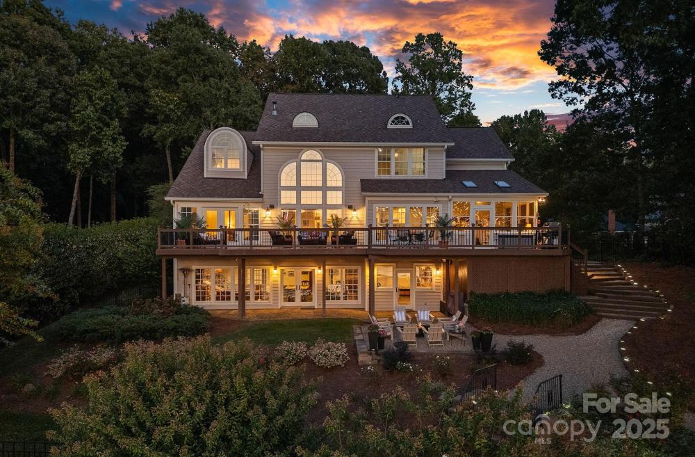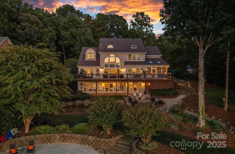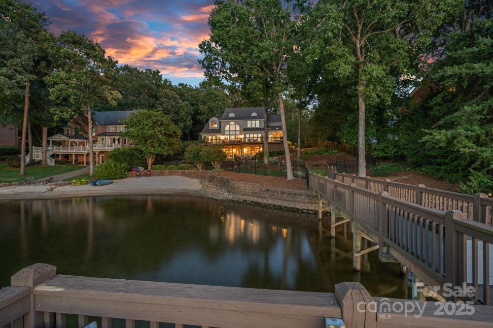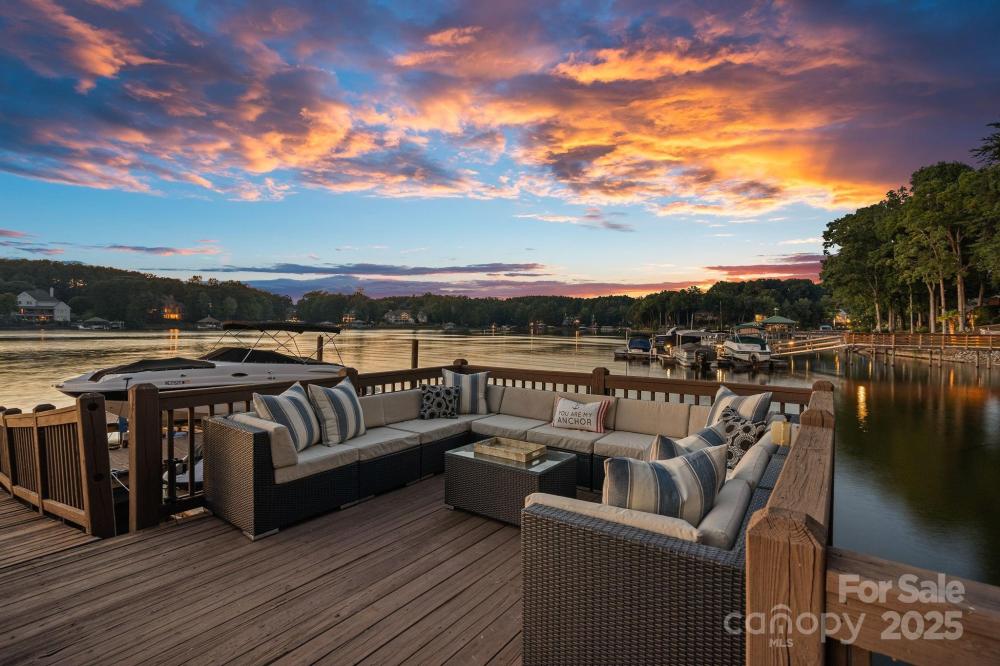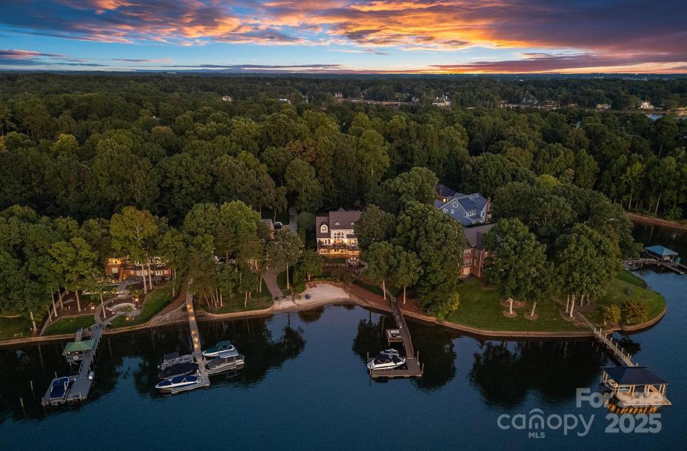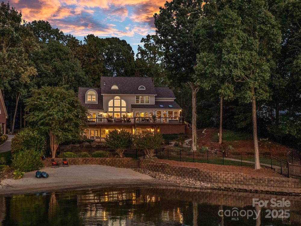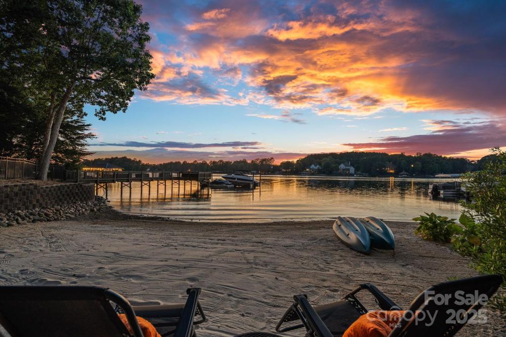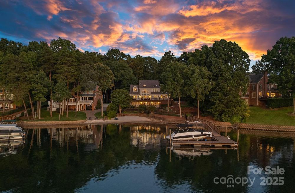 This stunning waterfront home in The Harbour at The Pointe boasts long-range spectacular sunset views and a private sandy beach. Spanning approximately 5,600+ sq. ft., it features 4 bedrooms, 4.5 bathrooms, a pretty kitchen with granite countertops, a lakeside primary suite, a sunroom off the kitchen, a dining room, a private office, a laundry room, and a two-story great room with a granite surround gas fireplace, all on the main floor. Upstairs, there are three bedrooms and a bonus room. The lake level is designed for fun, with a stylish family room, an expansive custom wood bar crafted by Vine and Branch, equipped with two mini refrigerators and a wine cooler refrigerator, a beautiful bathroom, a stone fireplace, and a billiard room. Outside, enjoy a CertainTeed roof, a vast wood deck approximately 750+ square foot, covered patio, fire pit, private dock with a newer hydrohoist boat lift and jet ski ramp, a sitting area, an outdoor shower, lake-fed irrigation, and mature landscaping on a cul-de-sac lot. Community amenities include a pool, two tennis courts, new pickleball courts being built, volleyball, basketball, a clubhouse, and a playground.