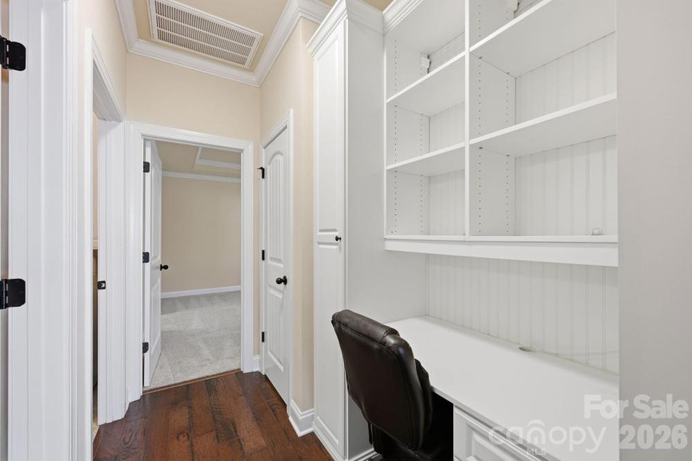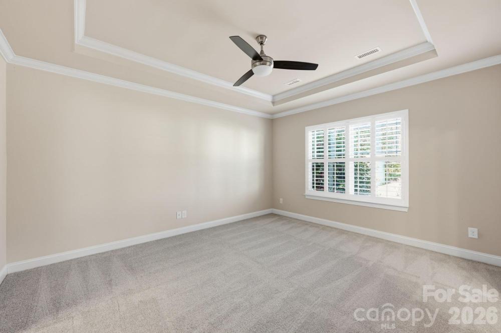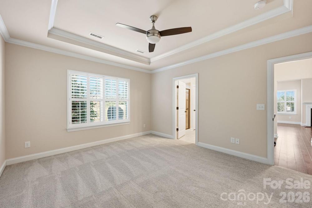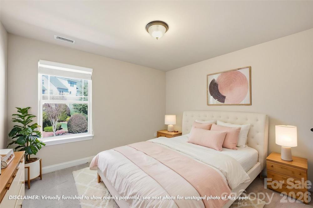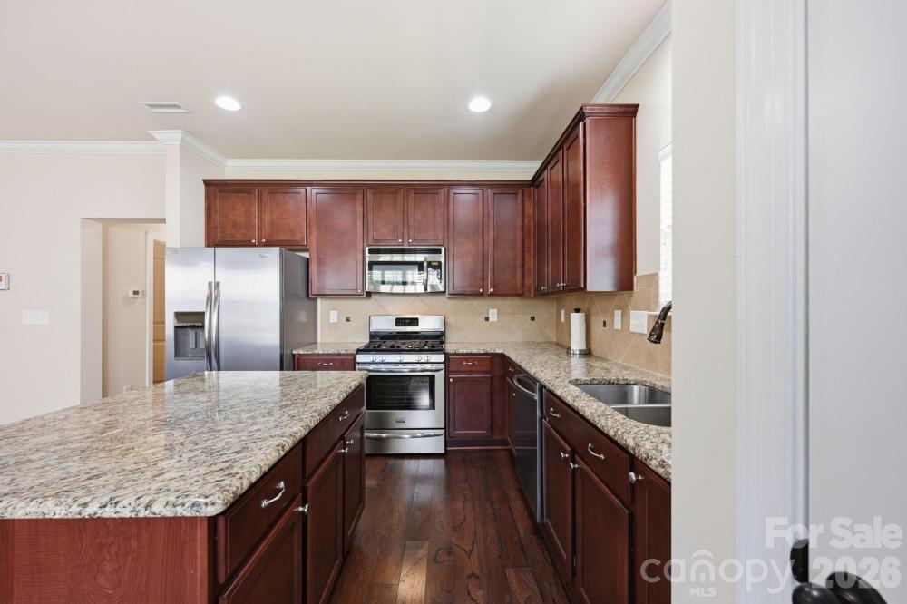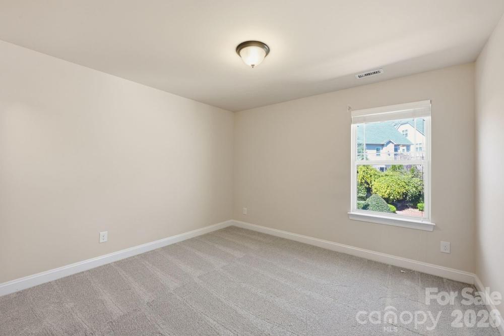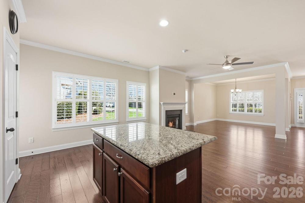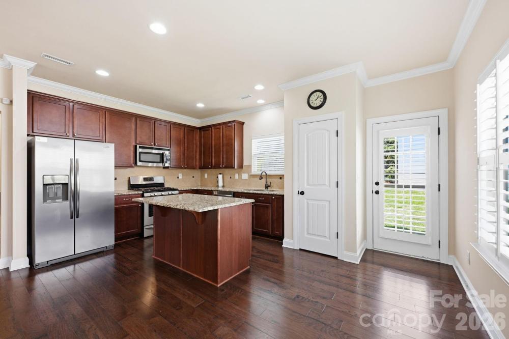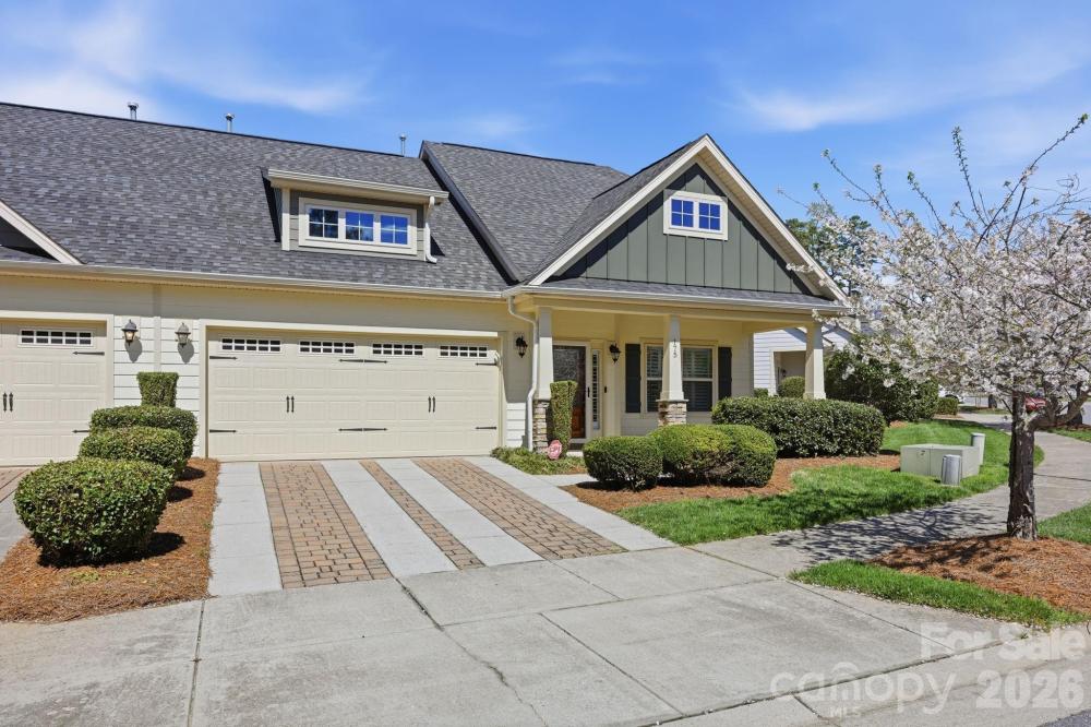 This well-maintained end-unit townhome is ideally positioned on a premium lot, backing to a beautiful park-like common area with a spacious side yard and located directly across from green space with walking trails. Move-in ready, this home features wood flooring, tile in the baths, and neutral carpet in excellent condition. The open-concept layout offers seamless flow from the foyer into the dining area, living room with gas log fireplace, and a well-appointed kitchen with space for a breakfast nook. Beautiful upgrades including plantation blinds throughout the main level. The kitchen is thoughtfully designed with granite countertops, a center island with breakfast bar, pantry with slide-out shelving, double stainless sink with sprayer and disposal, and stainless appliances including a Samsung dishwasher, Frigidaire gas range, and GE built-in microwave with exhaust. The main-level primary suite provides both comfort and convenience, featuring a walk-in closet with a custom organization system and an ensuite bath with tiled shower, linen storage, and a separate vanity area. Additional main-level highlights include a powder room, laundry room with garage access, and a built-in computer niche with adjacent storage closet. Upstairs offers flexible living space with a loft, two generously sized bedrooms, a full bath, and a large bonus room ideal for a media room, office, or guest retreat. Outdoor living is equally inviting with a rocking-chair front porch (with video doorbell) overlooking a wooded view and a private rear paver patio, complete with privacy fencing. Community amenities include a clubhouse with meeting space and fitness room, along with lawn care and exterior maintenance for easy, low-maintenance living. Tucked within a quiet community yet conveniently located with easy access to I-77, shopping, dining, and more, this home offers an exceptional combination of location, layout, and lifestyle, Come live the good life in Emerald Green Village!