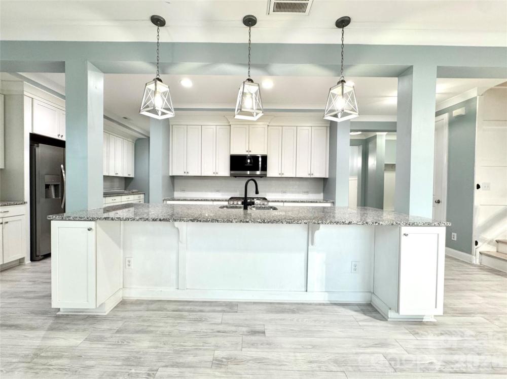 The open-concept chef’s kitchen showcases granite countertops, a gas range, large island, and walk-in pantry, flowing seamlessly into the light-filled living and dining areas. Custom details include plantation shutters, accent walls, barn doors, and handcrafted shiplap along the staircase and interior trim, adding warmth and character throughout the home.