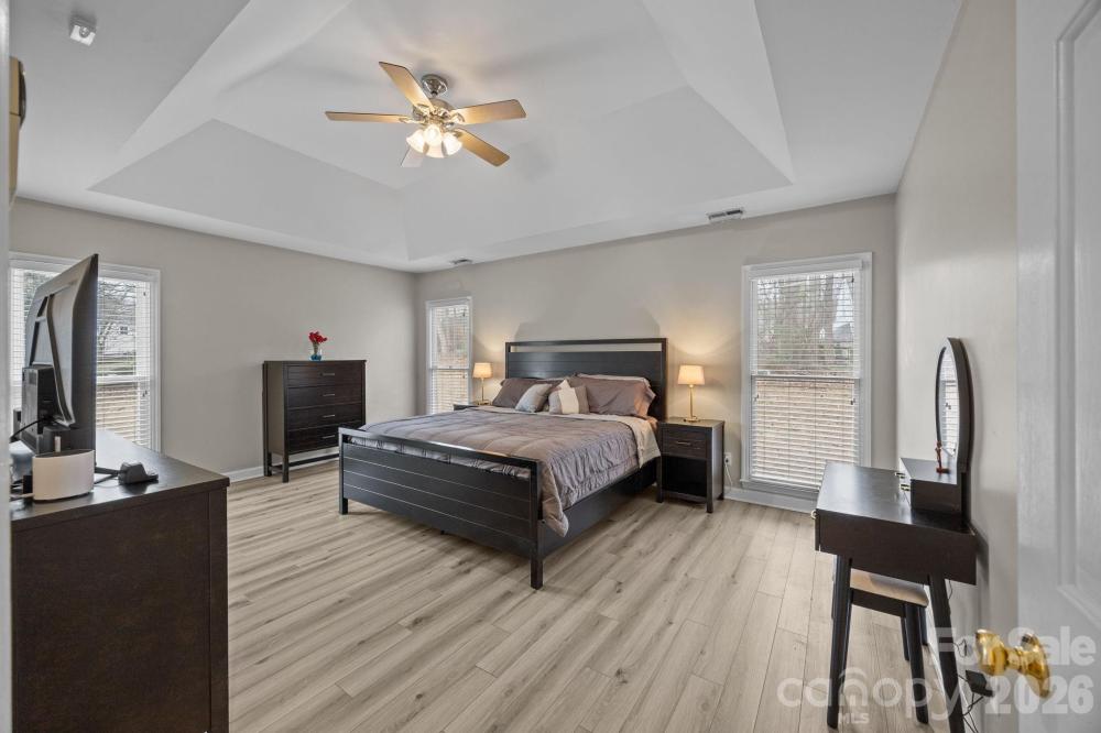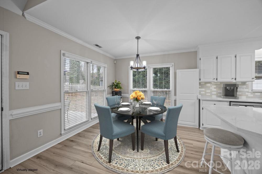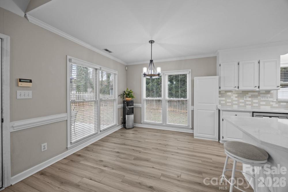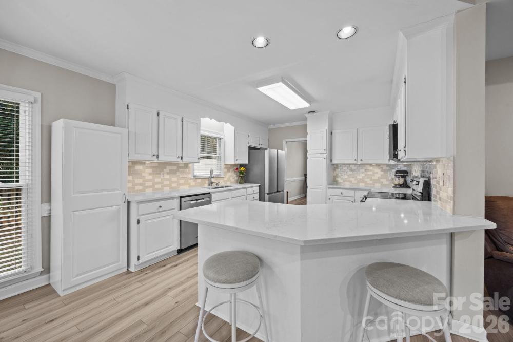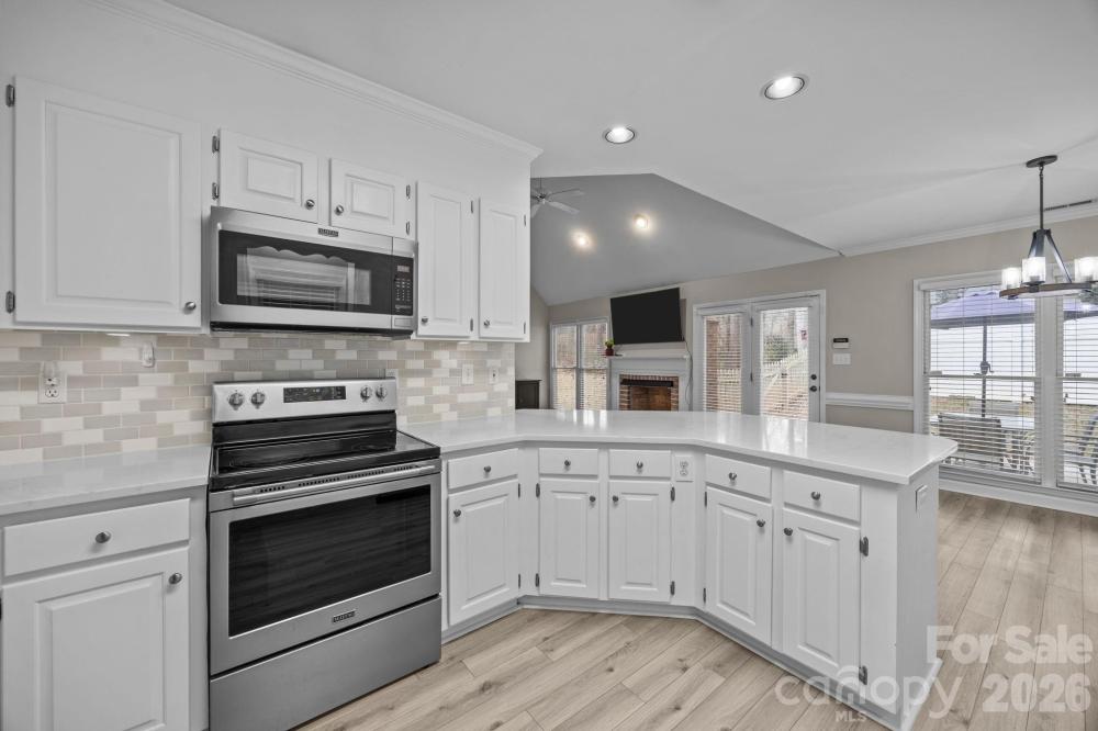 Move in ready home in desirable Franklin Grove featuring 4 bedrooms, including a main level primary suite. This bright, open floor plan offers a spacious great room with gas log fireplace and second story overlook. The kitchen was updated in 2021 with quartz countertops, classic subway tile backsplash, and new appliances, and opens seamlessly to the main living areas, ideal for everyday living and entertaining. Luxury vinyl plank flooring spans the main level, with new carpet upstairs. Major system updates include a new roof and HVAC in 2020 and a new hot water heater in 2022. Enjoy outdoor living in the private, fenced backyard with rear patio. The community offers access to the greenway and is adjacent to Bellingham Park, featuring trails and recreation. Conveniently located near Lowes Corporate Headquarters, just 10 minutes to downtown Davidson and minutes from downtown Mooresville. Zoned for Mooresville Graded Schools.