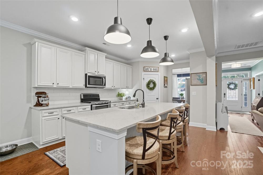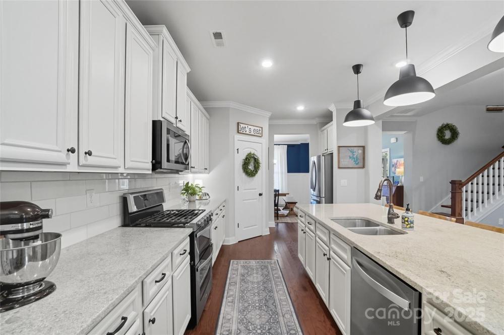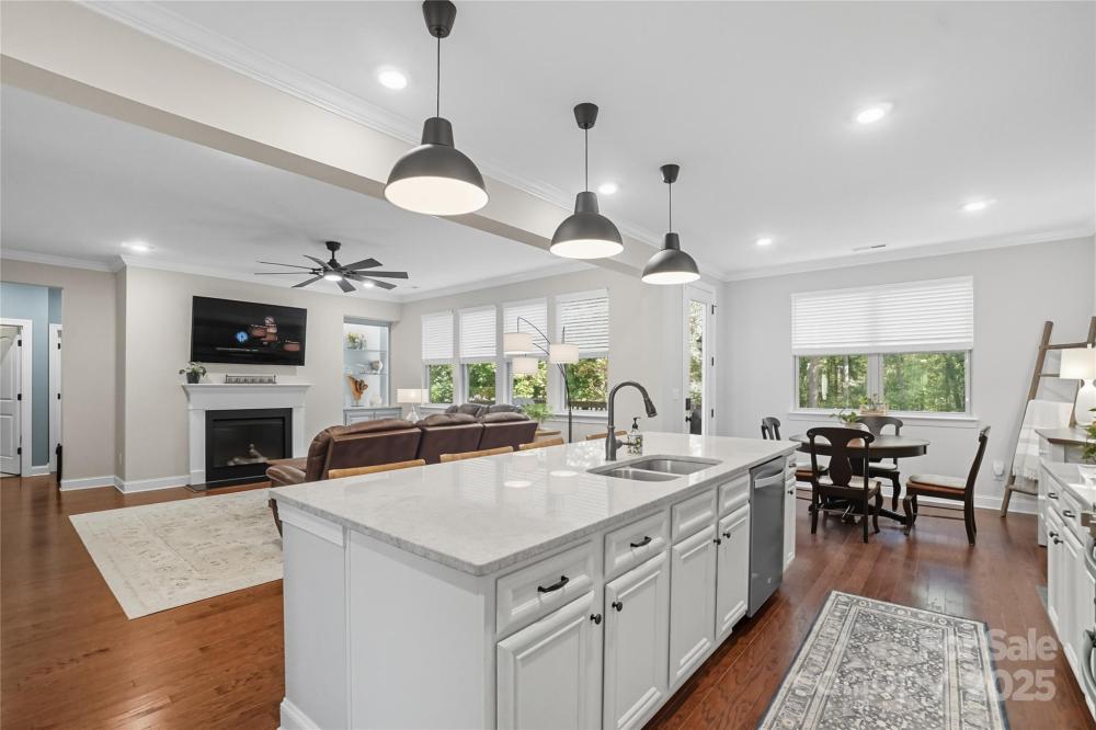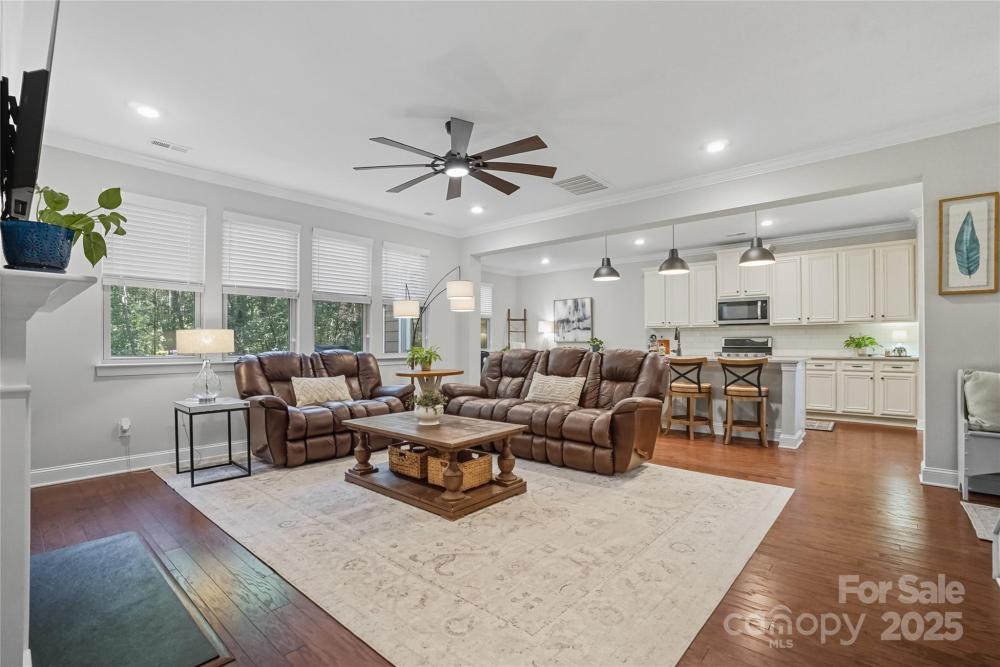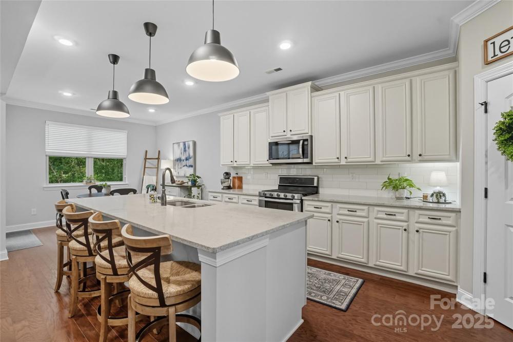 Discover the perfect blend of privacy and convenience in this Mooresville gem, set on just over an acre in a peaceful country setting, yet only minutes from Lake Norman, shopping, and dining. Tucked away on a quiet cul-de-sac, this 4-bedroom home offers inviting curb appeal with a rocking chair front porch and an expanded driveway for additional parking. The main level features a spacious office framed with French doors, an inviting family room with a gas fireplace and built in shelving, and versatile flex space ideal as a playroom, second office, or exercise room. The chef’s kitchen is a standout, featuring a gas range, oversized quartz island, and a spacious walk-in pantry.