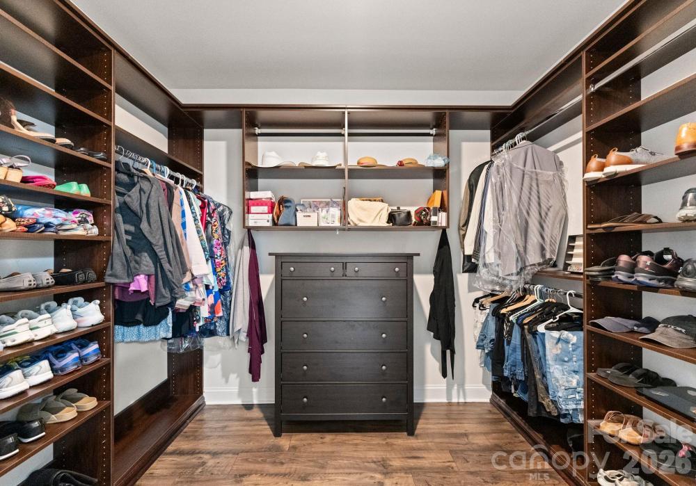 The primary suite on the main level offers exceptional comfort with a spacious 13’ x 17’ layout, dual walk-in closets, and a spa-inspired bathroom. Custom storage systems from California Closets elevate organization throughout the home, including the primary closet, additional closets, and even the garage.
