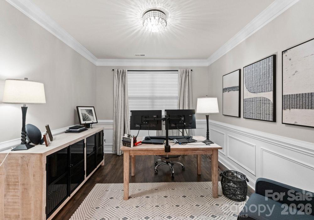 Upon entering, you’ll immediately notice the home’s impressive scale and attention to detail. A welcoming entry hall with elegant wainscoting sets the tone, while the thoughtfully designed layout makes the home feel even more spacious than expected. At the front of the home, a bright guest suite with large windows and a full bath offers privacy and comfort for visitors. Nearby, a dedicated office with glass French doors provides the perfect workspace and could easily serve as a formal dining room if desired.