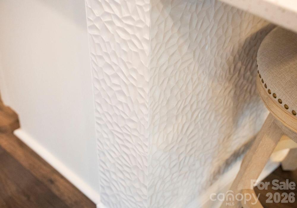 The home then opens into a stunning living area centered around a generously sized kitchen island featuring quartz countertops and custom Italian tile accents beneath the island. The living space feels bright and inviting thanks to additional windows added during the original construction, creating a warm and airy environment for everyday living and entertaining.