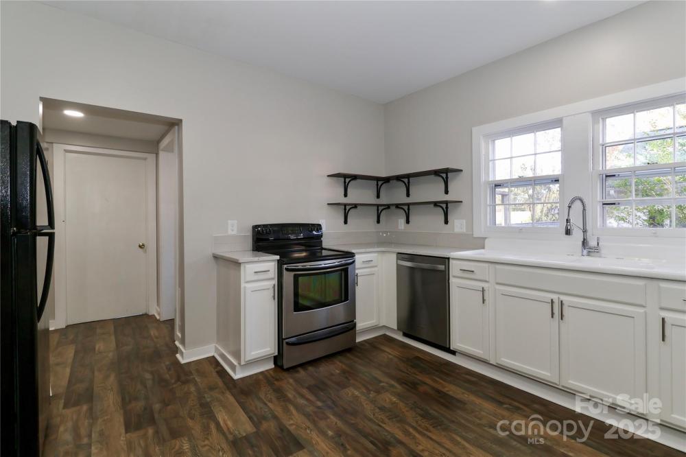 This beautifully updated home in the historic Mooresville Mill Village offers 3 bedrooms and 2 full baths, with a large flex space that could easily serve as a 4th bedroom. The home features all-new wiring throughout, new LVP flooring, and raised ceiling heights (now 9 ft in most main living areas). The kitchen has been fully refreshed with new cabinets, a tile backsplash, quartz countertops, and a new dishwasher. Additional updates include new gutters, vanities in both bathrooms, refinished historic sink, updated toilets and shower tile, new recessed lighting (wafer style) in the kitchen and hallways, and a new water heater (2023). The crawl space has been cleaned and treated with a vapor barrier, and new metal sheeting with insulation was added above the front porch. Enjoy a covered rocking-chair front porch, a beautiful level fenced backyard, and proximity to the newly reimagined Moor Park baseball field—home of the Mooresville Spinners. Just minutes from Historic Downtown Mooresville’s shops, restaurants, and local favorites offering craft brews, live music, and Southern charm.