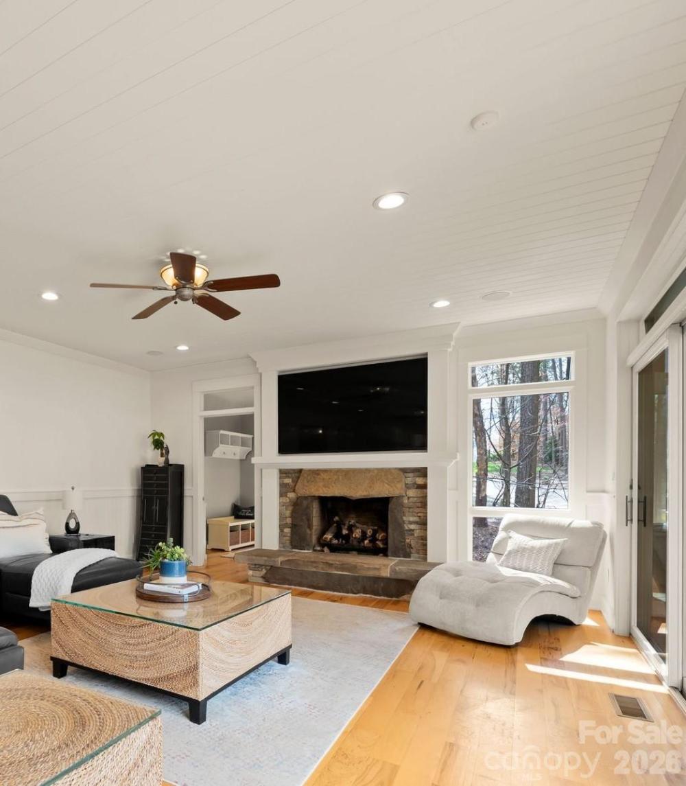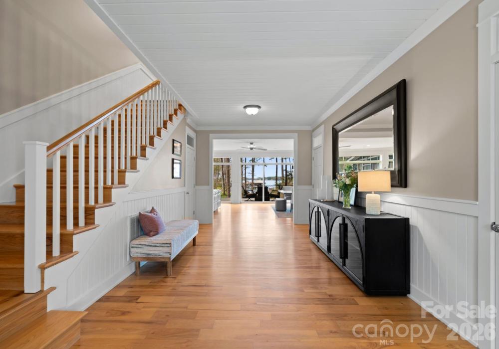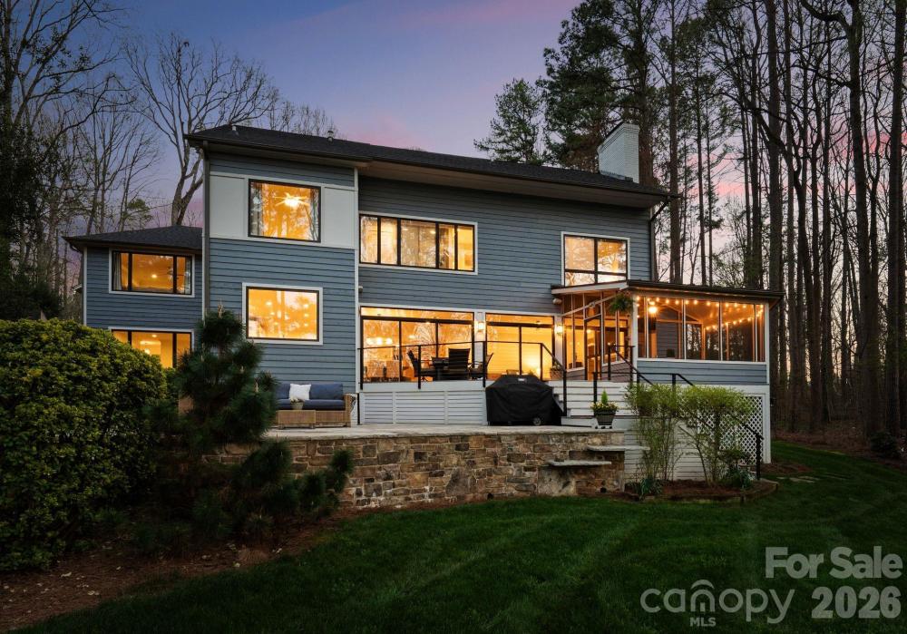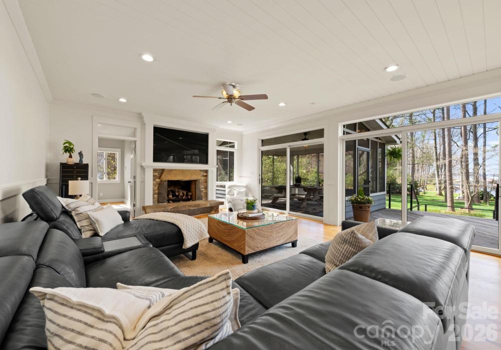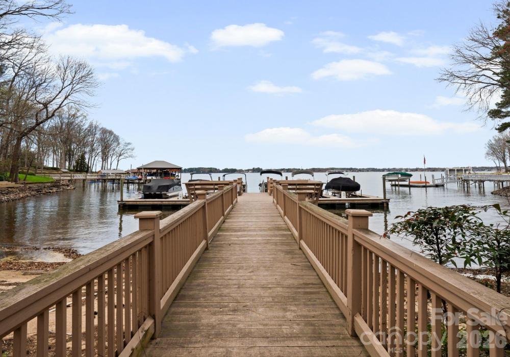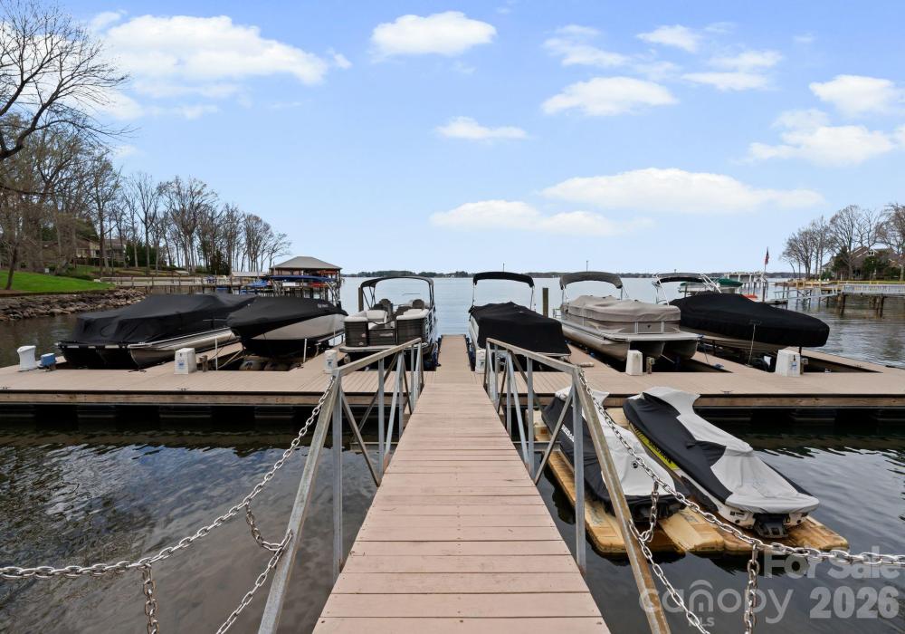 Quintessential Lake Norman lake house, completely reimagined and beautifully renovated through a thoughtfully designed 1,700-square-foot addition by architect Harry Schrader, offering long-range water views framed by towering mature trees and a peaceful, natural setting. Bordering approximately 3 acres of wooded common area, the home enjoys exceptional privacy and a natural backdrop rarely found. Inside, the light-filled open floor plan showcases warm hardwood floors, a beautifully updated kitchen with abundant cabinetry and workspace, and inviting gathering spaces designed for effortless entertaining. Large windows and glass doors open to the screened porch, bluestone terrace, and Ipe wood deck, creating seamless indoor–outdoor living and the perfect setting for relaxed lake days and sunset evenings. Every bedroom features its own private ensuite bath and walk-in closet, complemented by a bunk room, bar and entertainment space, workout area, and a dedicated art or creative room—thoughtfully designed for both everyday living and memorable lake weekends. The home also includes a spacious walk-in storage room with exterior access, ideal for conveniently storing kayaks, paddleboards, and lake gear. This property is considered water view, with an easement providing easy access to the lake just steps away—offering all the advantages of lakefront living. A deeded boat slip with lift and jet ski lifts sits just steps behind the property within a private six-slip floating dock shared by only a small collection of neighboring homes—offering the ease and enjoyment of lake access that lives much like waterfront. Additional neighborhood amenities include a beach area, tennis and pickleball courts, basketball court, pool with pool house, and a private neighborhood launch site. A rare opportunity to own a fully renovated Lake Norman retreat where privacy, nature, and timeless lake living come together beautifully.