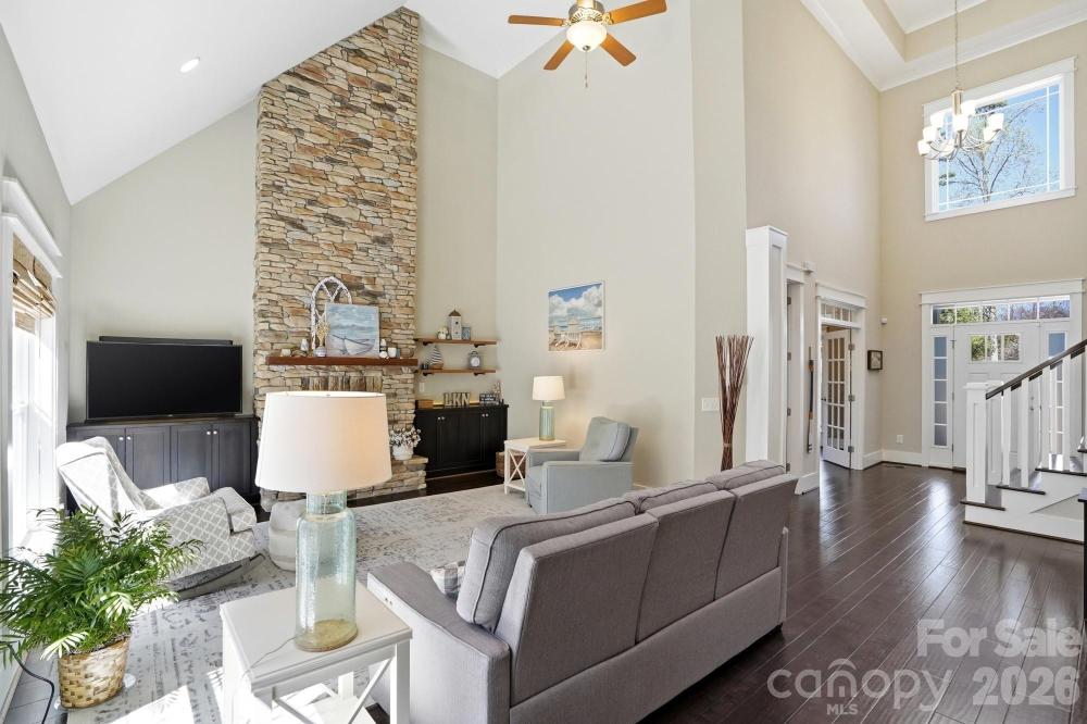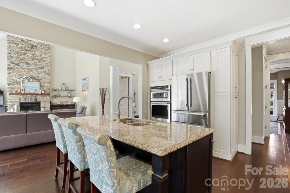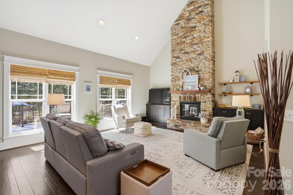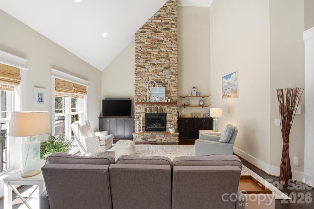 At the heart of the home, the soaring great room draws your eye upward and is beautifully anchored by a stone gas log fireplace, creating a space that feels both grand and inviting. The chef-inspired kitchen is designed for connection and conversation, featuring a large island, induction cooktop, built-in microwave, wall oven, sleek range hood, pantry, breakfast bar, and a light-filled bay window breakfast area.