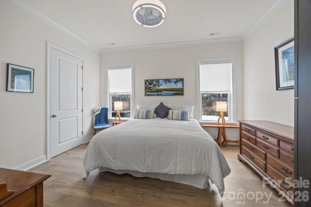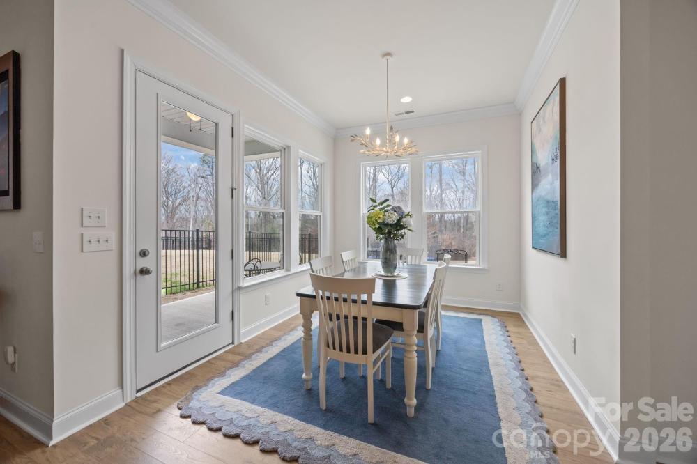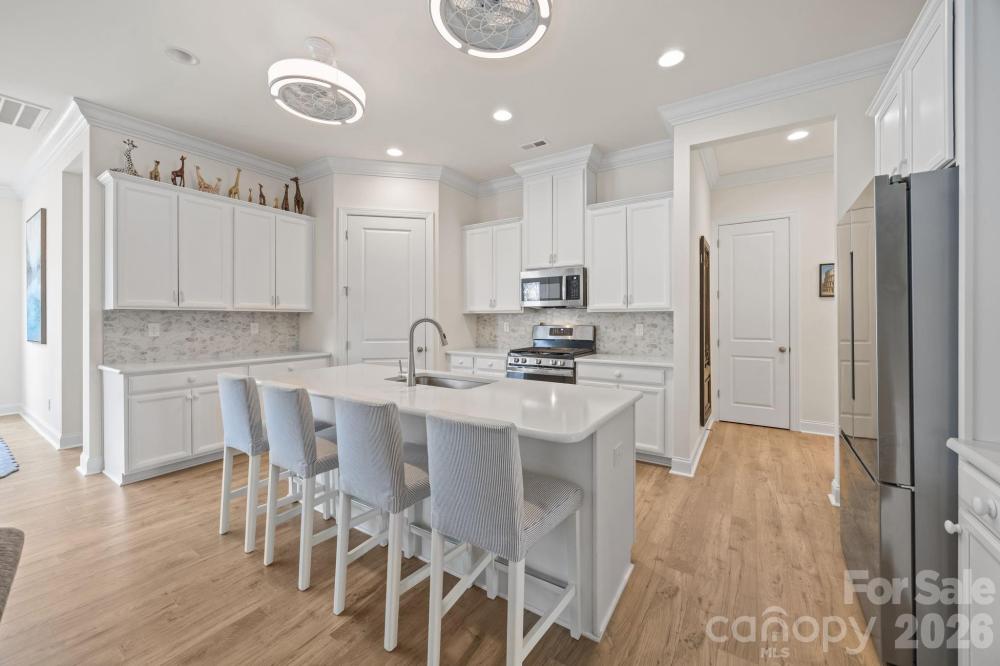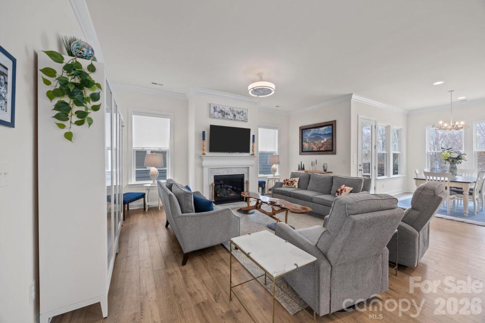Welcome to this meticulously maintained 3 bed/3 bath home situated on a corner, level lot in the conveniently-located Reids Cove community. This popular 1.5 story design features the benefits of a ranch home with the convenience of a massive bonus room and guest bedroom with full bath upstairs. The main level features soaring 10-foot ceilings and a spacious open floor plan with upgraded crown molding and baseboards, cozy fireplace (with energy-efficient blower), luxury vinyl plank flooring, and an abundance of natural light. The gorgeous kitchen is a chef's dream, complete with a extra large island, quartz countertops, an exquisite backsplash, gas range, and stainless steel appliances. The primary suite is secluded in the rear of the home with an ample walk-in closet. The ensuite bath features a garden tub, shower, and neutral matte granite countertops. The secondary bedroom has an adjacent full bathroom in the front of home and is currently being used as an office. Step outside to enjoy a morning coffee on your front porch or relax on the extended rear patio, perfect for entertaining friends and family. Community amenities include a beautiful outdoor pool, pickleball court, playground, and paddlesport launch site. Grocery stores, local hospital, coffee shops, restaurants, as well as all the delights of both Downtown Mooresville and Davidson are only minutes away.