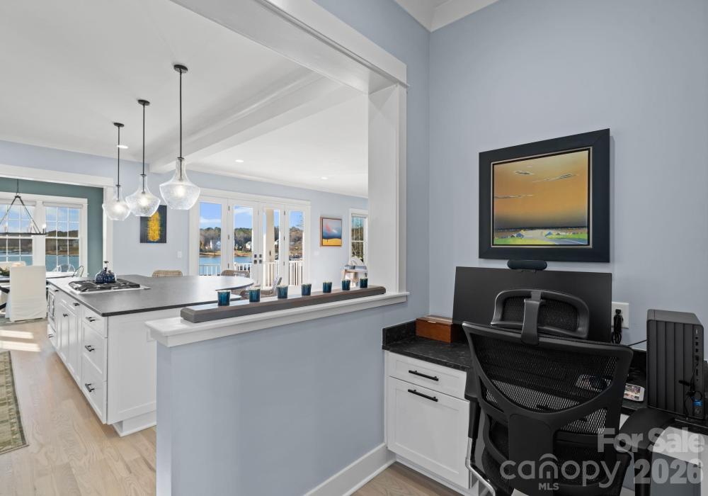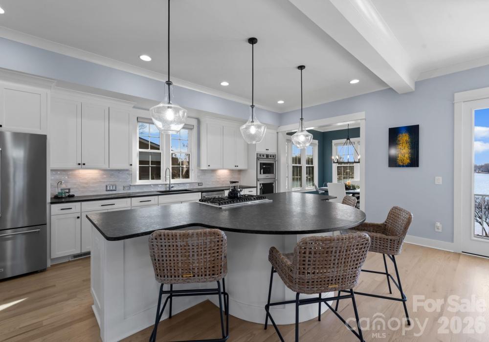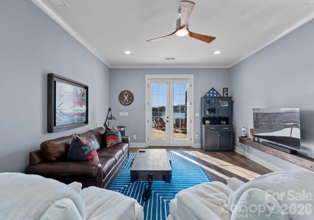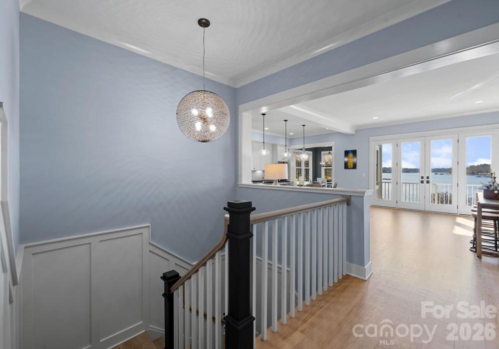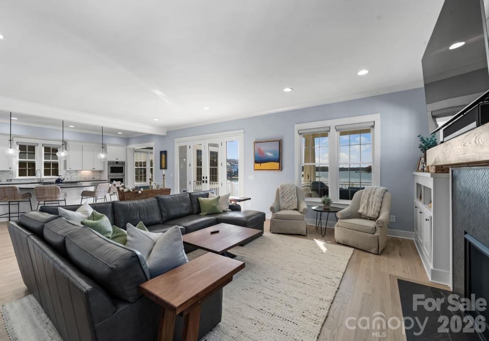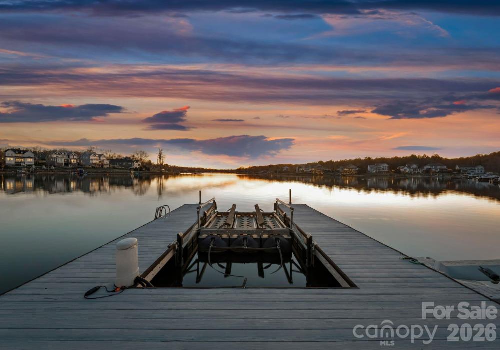 From the moment you step through the front door, uninterrupted lake views immediately set the tone for this thoughtfully designed waterfront home. Nearly every space on the main level captures the beauty of Lake Norman, creating a seamless connection between indoor living and the water beyond. The open-concept living area features newly refinished solid red oak floors and a cozy fireplace with a new knotty ash mantel—perfect for year-round enjoyment. The kitchen opens effortlessly to the family room, offering generous gathering space around the island, a custom pantry, and an easy flow ideal for entertaining. The dining area is perfectly positioned to enjoy breathtaking lake sunsets, while the upstairs patio invites morning coffee or evening wine with a view. The main-level primary suite offers abundant closet space and a refreshed bath with refinished cabinetry, new countertops, and custom Caribbean walnut-framed mirrors. A flexible room off the entry can be closed off for a home office or personal retreat. The lower level is designed for comfort and versatility, easily accommodating guests with durable LVP flooring throughout. A second primary-style bedroom downstairs is ideal for long-term guests, with additional bedrooms offering beautiful lake views. A custom Murphy bed in the exercise room adds even more flexibility. Storage space for lake toys and an extended slate patio create the perfect setup for entertaining outdoors, complete with a firepit and an 8-person Hot Spring saltwater hot tub. Enjoy easy access to the dock, featuring solar lighting, a hydro lift rated for up to 6,000 lbs, and a jet ski dock—all tucked into a quiet, playful cove ideal for lake days. Major systems including the tankless water heater, HVAC, and water softener have received regular preventive maintenance for peace of mind. A rare blend of views, function, and waterfront lifestyle—this Lake Norman home is designed to be enjoyed in every season.