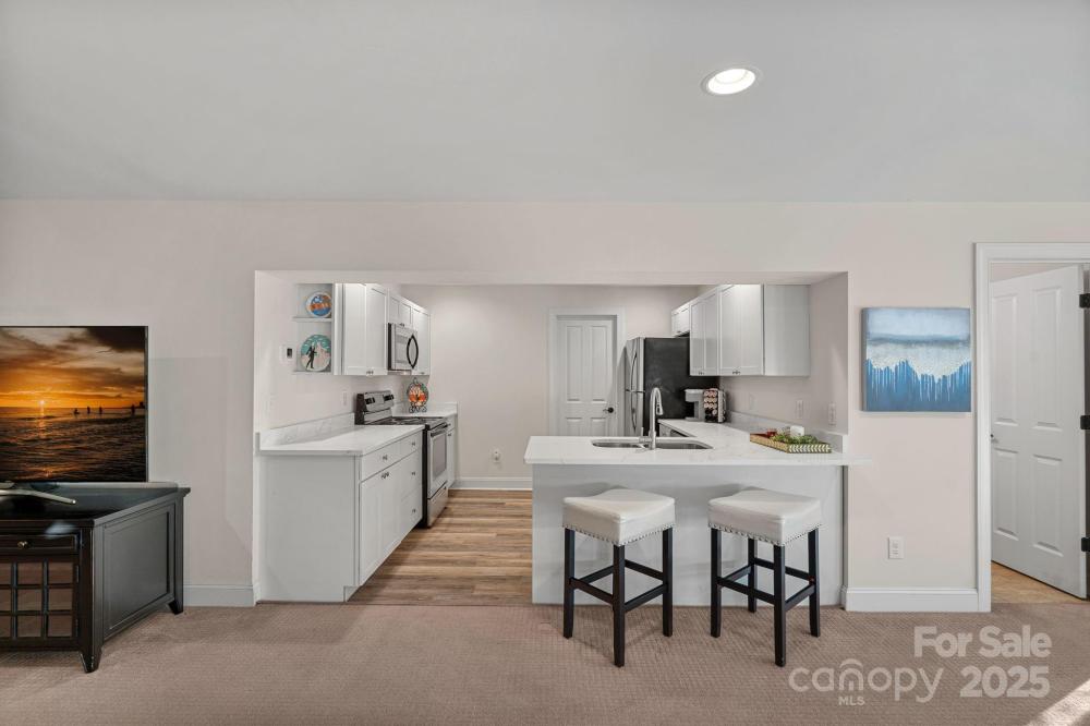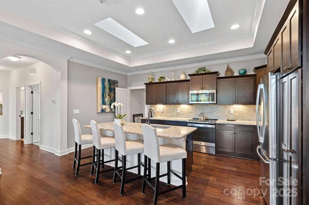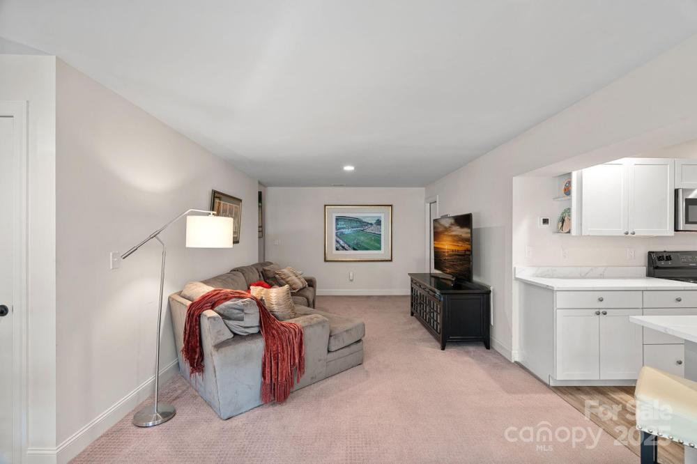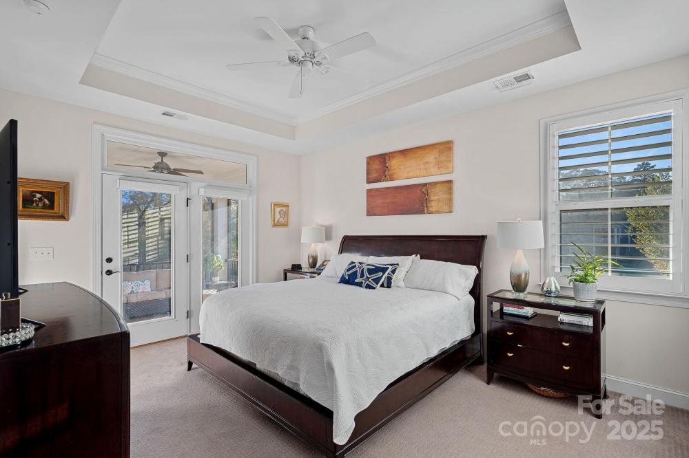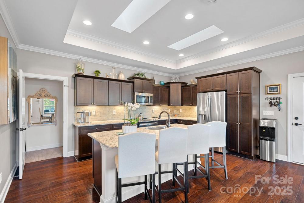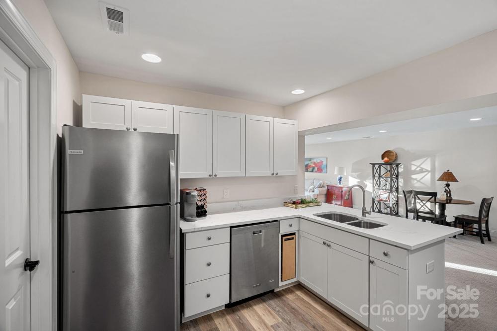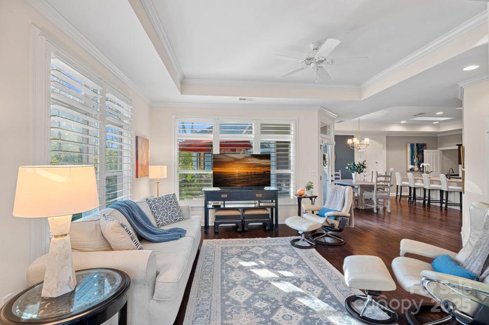 With a private, fully-equipped and functional lower level second living quarters AND magnificent SUNSET views, this exceptional home offers a combination of functionality, comfort and beauty. Perfectly situated on one of the most desirable lots in this 55+ community of The Courtyards of Huntersville, the property enjoys unmatched privacy with no home directly across the street or to the side and is quietly tucked away at the back of the intimate neighborhood. A major highlight is the thoughtfully designed LOWER LEVEL SUITE, ideal for multigenerational living or guests. This private space has its own exterior entrance and includes two living areas, a dining area, a full kitchen with new quartz countertops and sink, full-size appliances and an oversized pantry. The suite also features a spacious bedroom with a walk-in closet and pond views, a full bath with a new vanity, stackable, full-size washer and dryer, and a private patio overlooking a tranquil reflection pond and water feature. The main level is filled with natural light thanks to the absence of an adjacent home, as well as skylights in the kitchen and primary bath. The layout includes a welcoming foyer, a sunroom/home office, living and dining rooms, a spacious kitchen, laundry room, and a full guest bath, along with a primary suite and an additional guest bedroom. An upgraded kitchen boasts quartz countertops, a subway tile backsplash, a new range and dishwasher, and a pantry cabinet with pull-out shelving. The optional sunroom/office features a custom built-in desk with a quartz countertop, lockable drawers, storage, slide-out printer trays, and a built-in bookshelf—perfect for working from home. An enhanced laundry room includes upper and lower custom cabinetry with glass doors, a deep sink, subway tile backsplash, and a built-in beverage refrigerator creating a fully functional mini beverage bar. Both main-level baths have been updated with new quartz countertops, deep sinks, and faucets. The primary bedroom is a true retreat, complete with a spacious Closets By Design custom closet system and direct access to a screened and covered deck area. A new screened porch off the primary bedroom features two custom retractable screens, and elegant plantation shutters with dual control have been installed throughout the home. A maintenance free, elevated deck with multiple seating and dining spaces, spans the side of the home and overlooks a natural area where breathtaking sunsets will be enjoyed. The two-car garage offers epoxy-coated, non-skid flooring and a convenient wall-mounted vacuum unit. Pull down garage stairs leads to an incredible amount of storage above the garage. Five ceiling fans have been added in living spaces and bedrooms. The home's exterior was freshly painted in 2025 and features an attractive combination of fiber cement and stone. The community offers a wide range of amenities, including a clubhouse for social events with a full kitchen, fitness facility, and swimming pool. Sidewalks and streetlights, natural areas, extensive landscaping and pond add to the neighborhood’s charm. The HOA maintains all landscaping (except private courtyards) and the exteriors of the homes so homeowners only need an HO6 insurance policy. Two kitchen refrigerators, beverage refrigerator and two washer and dryers are included. Easy access to Beatties Ford Road, Gilead Road, Hwy 73 and I77, Birkdale, Blythe Landing, Jetton Park, Marinas, Shopping and Dining. In close proximity to hospitals/medical centers. The Courtyards of Huntersville homes are classified as condos by the Town of Huntersville but live like single family homes.