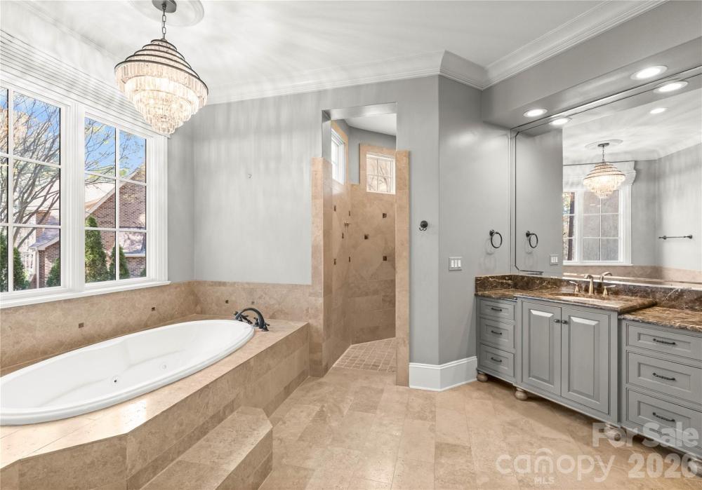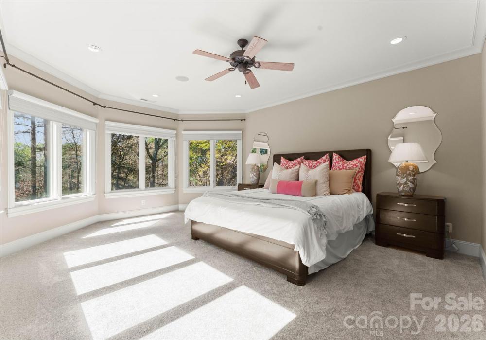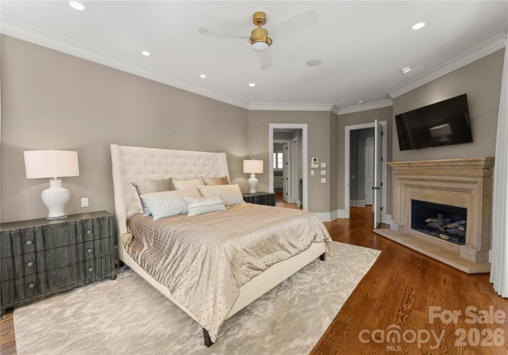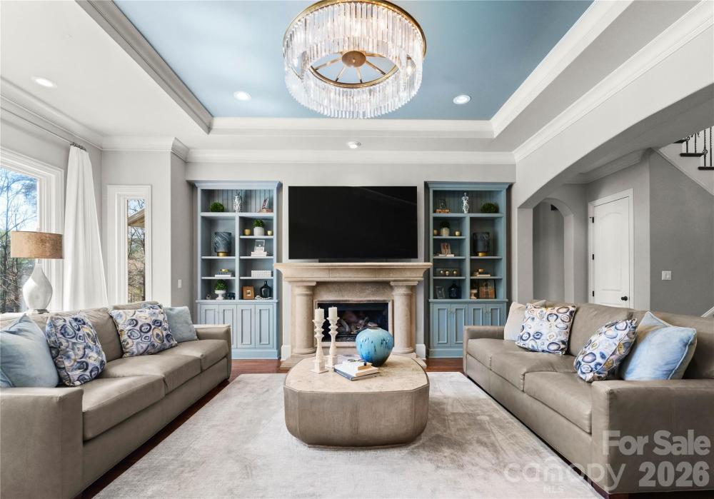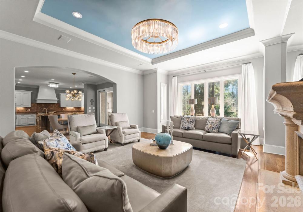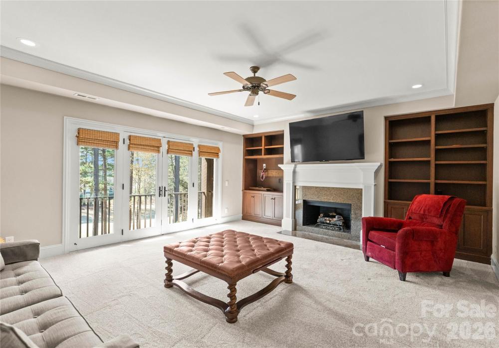 Enjoy breathtaking sunset views over the 3rd hole of Trump National Golf Course from this exceptional estate nestled within The Point. Set on 0.78 acres and offering over 5,700 square feet, this impeccably maintained 4 bedroom, 4.5 bath residence blends timeless elegance with modern comfort, delivering a truly elevated lifestyle. The outdoor living experience is truly resort caliber, featuring an expansive hardscape designed for both relaxation and entertaining. Enjoy a thoughtfully designed custom hardscape sunken fire pit, outdoor kitchen with grill and bar, and a saltwater pool and spa, creating your own private oasis overlooking the course. Inside, a grand two story foyer with designer lighting sets an impressive tone. The open concept main level is anchored by a stunning living room with a fireplace, custom built ins, and sweeping views, flowing seamlessly into a sunlit breakfast area and a beautifully appointed chef’s kitchen with granite countertops, designer finishes, and updated hardware. A serene sunroom with its own fireplace offers a peaceful retreat, while the formal dining room, complete with butler’s pantry access, is ideal for hosting elegant gatherings. The main level primary suite is a true sanctuary, featuring a beautifully mantled fireplace, private access to a covered patio, an expansive custom walk in closet, and a spa inspired bath with a soaking tub and oversized walk in shower. Upstairs, newly installed carpeting enhances a bright and spacious bonus room overlooking the backyard oasis and golf course. A secondary primary suite with en suite bath and walk in closet provides flexibility for guests or multi generational living. Additional generously sized bedrooms, a shared bath, and a versatile recreation space complete the upper level. Dual laundry rooms on both floors add everyday convenience. Recent upgrades include a new roof in 2022, an EV charger garage hookup, updated lighting and fixtures, and extensive irrigation and hardscape enhancements. Residents of The Point enjoy access to premier amenities through a Social Membership, including dining, fitness, tennis, swimming, and a vibrant calendar of community events, delivering a true country club lifestyle. This is luxury living redefined, where every detail has been thoughtfully curated for comfort, style, and effortless entertaining.
