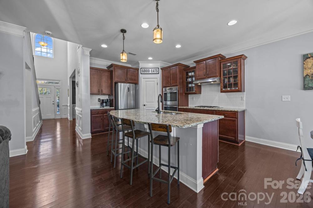Sophistication abounds in this elegantly appointed 4-bedroom, 3-bath home located in the highly desirable Farm at Riverpointe. Step into the light-filled two-story foyer and admire the dramatic dining room, also ideal as an office or den, featuring coffered ceiling and detailed wainscoting. The inviting family room offers an open floor plan with gas fireplace and ceiling fan, perfect for both relaxing and entertaining. The dreamy chef-style kitchen is a standout, boasting an oversized entertaining island, granite countertops with subway-tile backsplash, gas cooktop, double ovens, stainless steel appliances, pantry, and updated lighting throughout the main level. A spacious breakfast nook completes the space. A main-level bedroom with an adjacent full bath provides excellent flexibility for guests or multigenerational living. Upstairs, the expansive primary suite features a tray ceiling and En-Suite bath with dual vanities, soaking tub, tiled shower and flooring, and a generous walk-in closet with custom built-ins. Two additional bedrooms, a versatile bonus room, and an open landing area complete the second floor. The backyard is designed for outdoor living, featuring a paver patio with large island grill, a fully fenced yard, and the privacy of a cul-de-sac lot. This exceptional community truly has it all, offering Resort-Style amenities including a Junior Olympic pool, tennis and pickleball courts, volleyball, soccer field, basketball court, dog park, playground, picnic and grilling area, clubhouse access, and year-round events for the whole family. Don't let this gem get away!