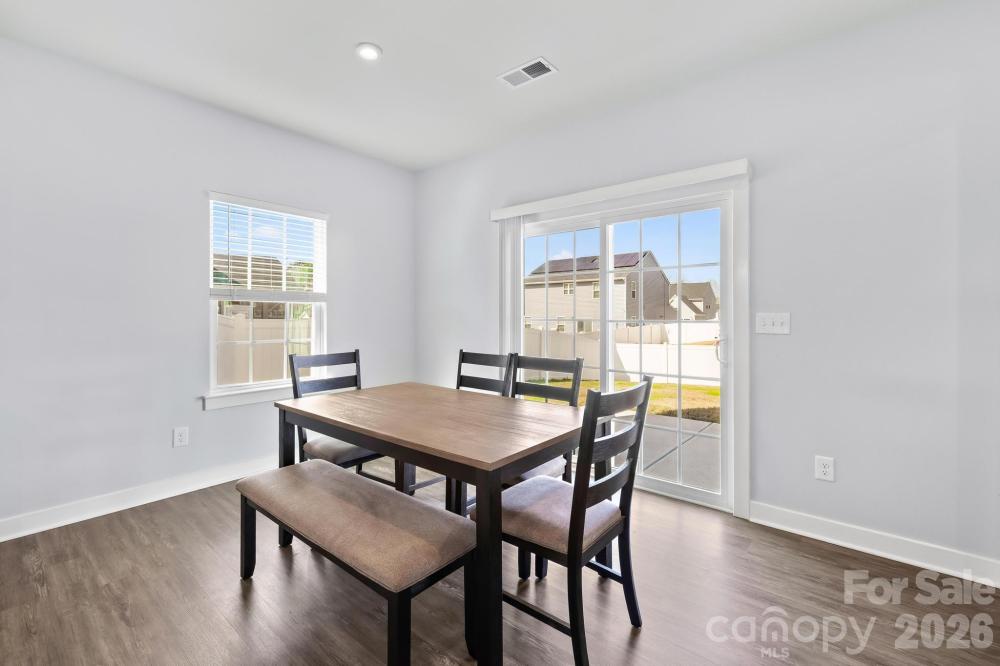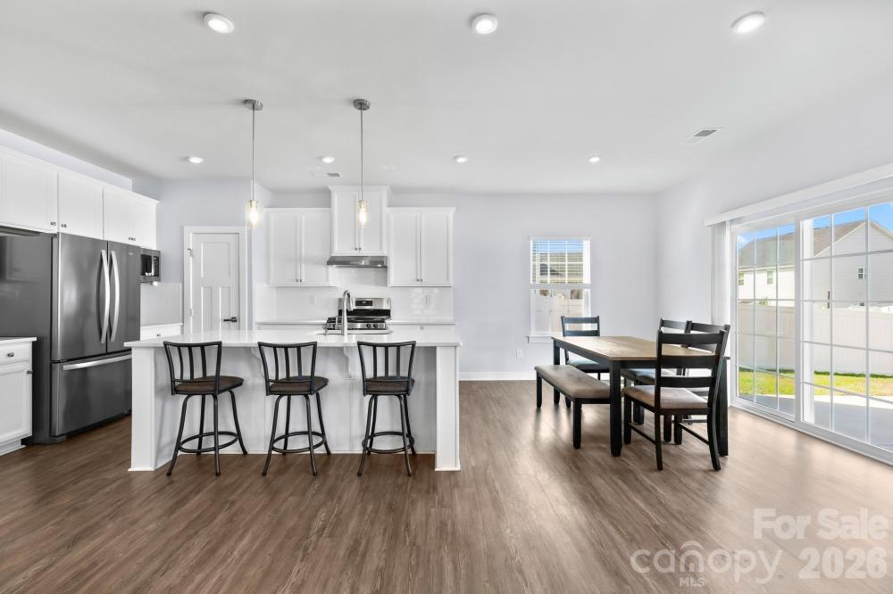 The open-concept kitchen, dining area, and family room are designed for both everyday living and entertaining. The kitchen features 42" white cabinets with a convenient trash can rollout, quartz countertops, subway tile backsplash, stainless steel appliances, a gas range, pantry, and a spacious island with seating for casual meals. A roomy dining area and comfortable family room create a seamless flow for gatherings.