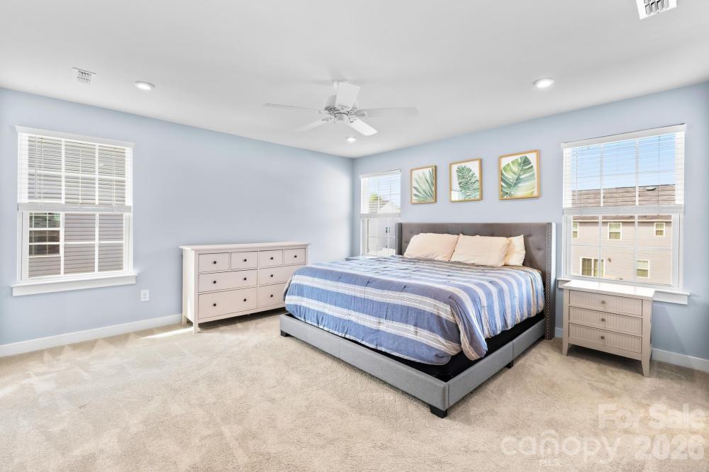 Upstairs, the primary suite offers plenty of space for a king-size bed and includes two walk-in closets. The primary bath features a dual-sink vanity and a beautifully tiled shower with dual shower heads and a built-in bench. Three additional bedrooms—all with ceiling fans—provide flexibility for family, guests, or home office needs. The laundry room stands out with decorative wallpaper and added shelving for both style and function.