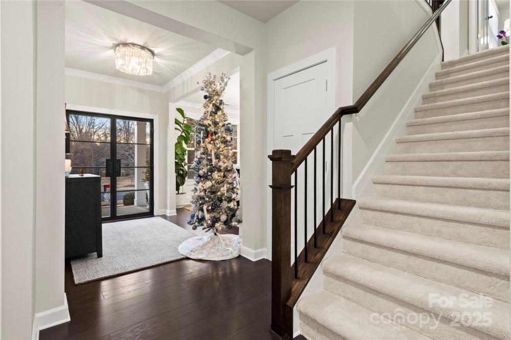 The entryway sets an elevated tone with custom double full glass and iron doors, an architectural upgrade unmatched within the community. This distinctive feature is one of the most significant enhancements to the home, offering both visual impact and craftsmanship that distinguishes it from neighboring properties. Framed by crown molding and paired with a Restoration Hardware chandelier, the entry creates an immediate impression of design-forward elegance. Just off the foyer, the formal dining room features its own crown molding and a James R Moder chandelier with Swarovski crystals, setting a sophisticated tone.
