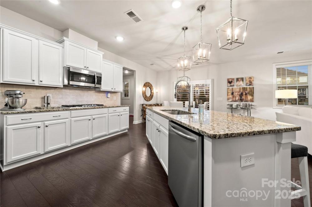 Beyond, the home opens to its central living and entertaining spaces. The gourmet kitchen is equipped with Frigidaire Gallery stainless steel appliances, built-in double wall convection ovens, microwave, dishwasher, disposal, and refrigerator plumbed for ice, gas cook-top, soft-close cabinetry, a large eat-at island, walk-in pantry and upgraded lighting including open lantern-style pendant lights that enhance the cooking and entertaining experience. Adjacent to the kitchen, a breakfast area features a coordinating chandelier and custom plantation blinds over the sliding glass door that opens to the patio.