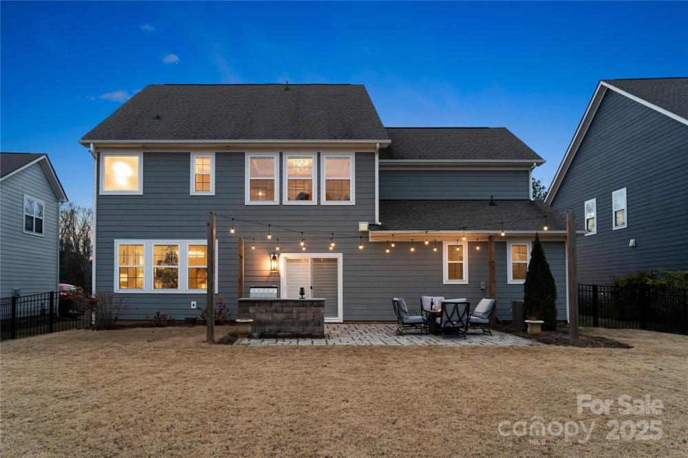 The outdoor living area showcases a newly extended patio with stone pavers, party lights controlled via app, and a built-in propane grill. Renderings from Premier Pools & Spas are available for a future backyard pool addition. Additional updates include new 60-ounce carpet with premium padding on the upper level and fresh interior paint throughout.