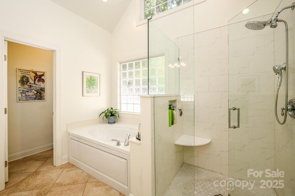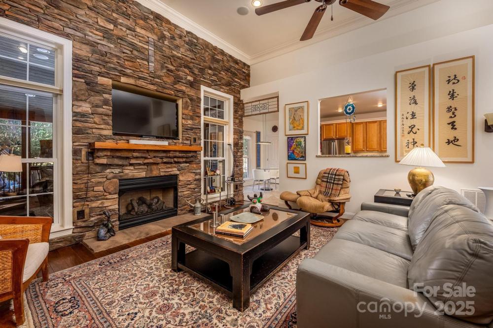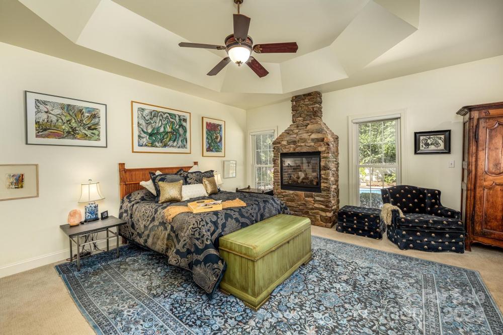 The spacious primary suite is a private retreat with tray ceiling, sitting area, and a stunning stone fireplace. The en-suite bath offers a cathedral ceiling, dual vanities, a garden tub, separate shower, and a generous walk-in closet. The split-bedroom design provides privacy for guests or family, while the upper-level bedeoom with full bath makes an ideal flex space—perfect for a home office, guest suite, exercise room or media room.